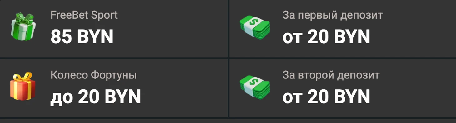 фиксированный размер фрибета 85 BYN, даже при внесении минимального депозита в 20 BYN;