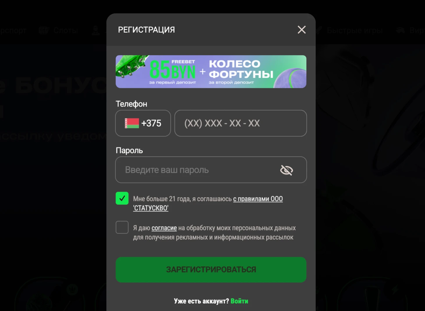 Форма верификации счета может отличаться в зависимости от региона проживания игрока. При пополнении счета важно внести первый депозит от 20 BYN, если сумма будет меньше, а второй депозит соответствует условиям акции, то игрок теряет право на фрибет.