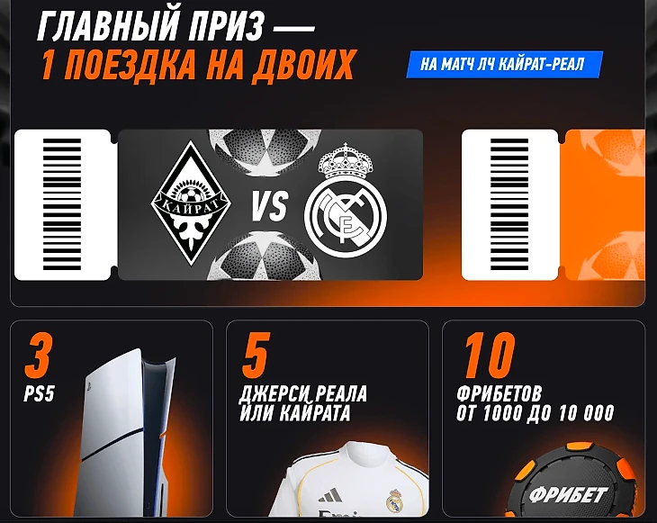 1 главный приз – поездка на двоих на матч «Кайрат» – «Реал Мадрид» в Казахстан (перелет, проживание, билеты).
