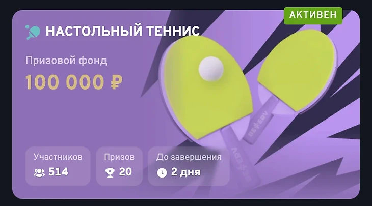 Букмекер BETTERY приглашает клиентов принять участие в специальном турнире по настольному теннису с еженедельным розыгрышем призов. Акция разделена на четыре независимых этапа по одной неделе каждый. Участники делают ставки на настольный теннис и получают баллы за выигрышные прогнозы.