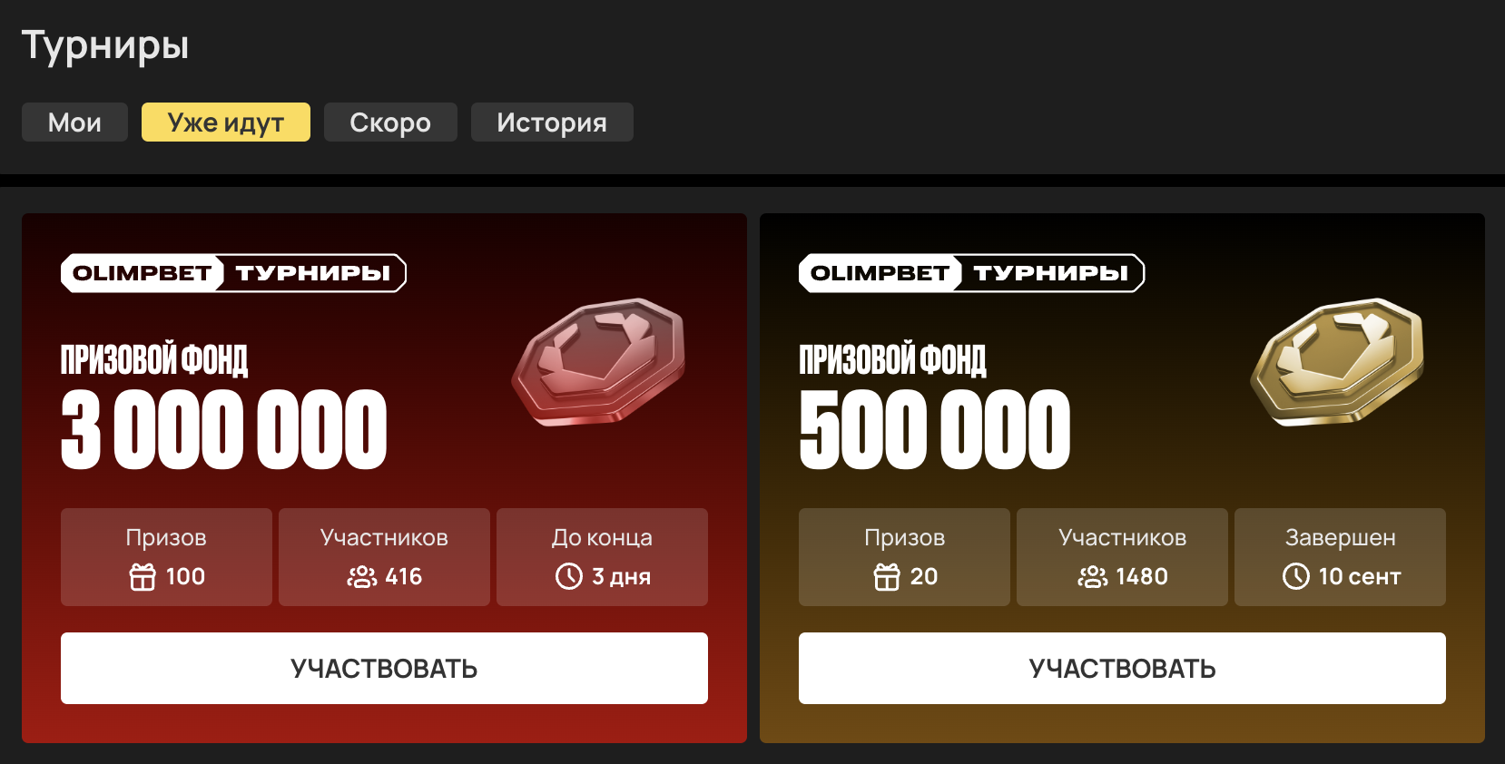 Для того чтобы принять участие в турнире, необходимо быть зарегистрированным пользователем OLIMPBET, достигшим 18-летнего возраста. Основное условие – предварительно нажать на кнопку «УЧАСТВОВАТЬ» на специальной странице каждого отдельного Турнира. В борьбе за баллы учитываются только пари, заключенные на события спортивной линии или лайва с минимальной суммой 1 000 рублей. Подходят ординары с коэффициентом от 1.30 и экспрессы от 1.80 в зависимости от условий турнира.