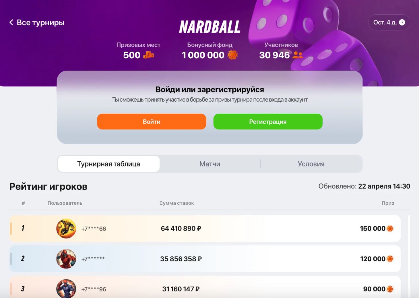 Новый турнир под названием Nardball за ставки в разделе Игры 24/7 предлагает участникам побороться за часть внушительного призового фонда в 1 000 000 рублей, где главный приз – фрибет номиналом 150 000 рублей. Побеждает тот, кто наберет наибольший объем ставок по итогам акции.