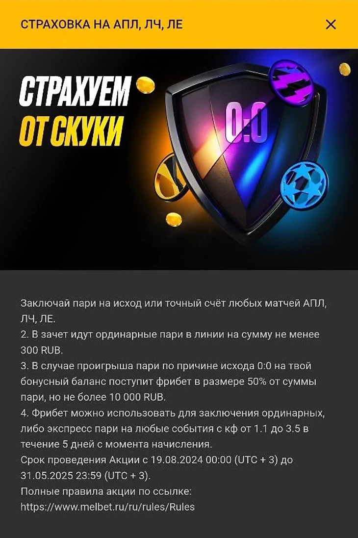 «Мелбет» страхует своих клиентов от скучного футбола! Букмекер предлагает клиентам заключать пари на точный счет или основные исходы матчей АПЛ, Лиги чемпионов и Лиги Европы, а случае нулевой ничьей дарит фрибет в размере 50% от суммы ставки до 10 000 рублей.