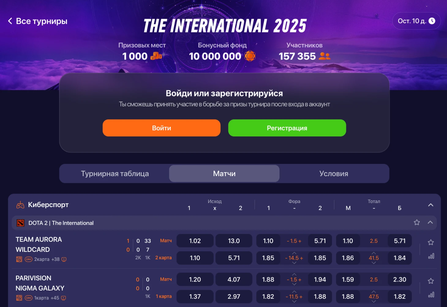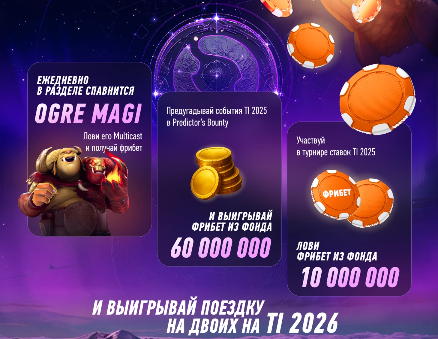 Кроме того игроки могут принять участие в отдельном тематическом Турнире The International 2025, в рамках которого разыгрывается дополнительные 10 000 000 фрибетов и главный приз — поездка на двоих на следующий турнир TI 2026.