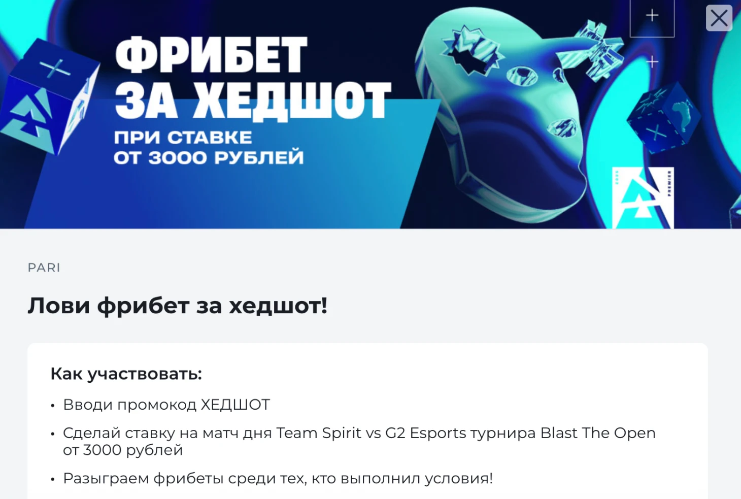 Чтобы стать участником розыгрыша фрибетов, необходимо выполнить два условия. Во-первых, авторизоваться и активировать промокод ХЕДШОТ в своем аккаунте Pari. Во-вторых, начать заключать одиночное пари (ординар) на сумму от 3 000 рублей на специально выбранный «матч дня» турнира BLAST Open London 2025 по CS2.