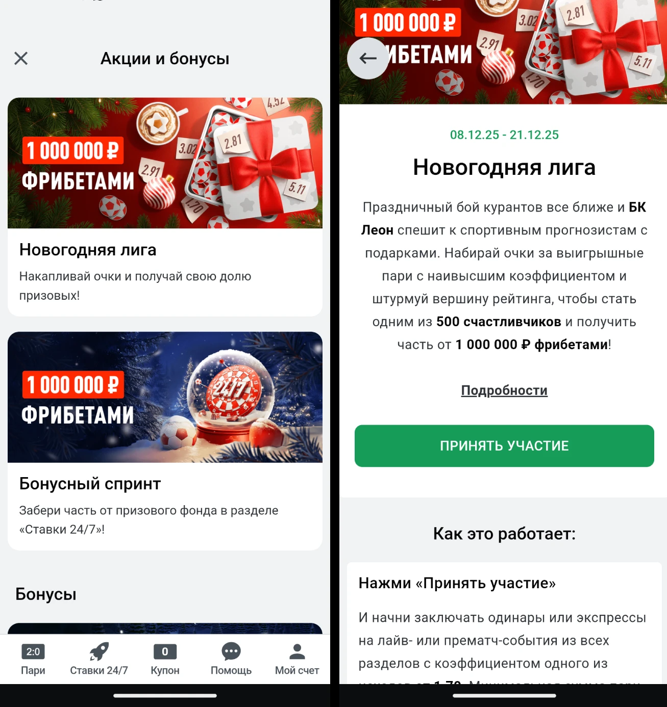 Сроки проведения акции – с 8 по 21 декабря 2025 года. Участие могут принять все зарегистрированные и идентифицированные пользователи «Леон», которые предварительно нажали кнопку «Принять участие» на промо-странице. Учитываются пари типа «одинар» или «экспресс» на события до начала (прематч) или в прямой трансляции (лайв).