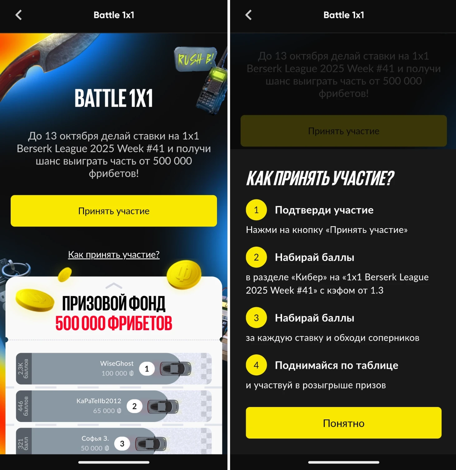 В ситуации, когда у нескольких участников оказывается идентичное количество баллов, более высокую строчку в рейтинге займет тот, кто раньше подтвердил свое участие в акции. Итоги будут подведены сразу после завершения (13 октября 2025), а уведомления о начислении фрибетов победители получат в этот же день.