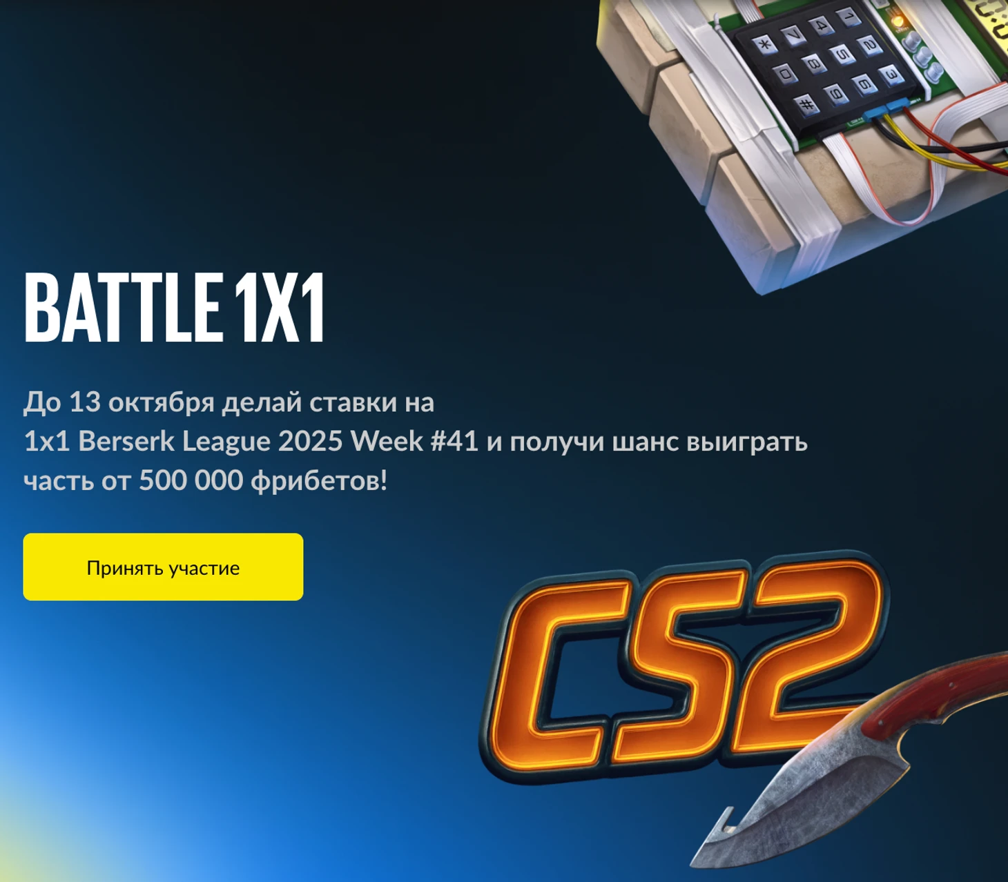 BetBoom приглашает всех поклонников киберспорта в уникальное противостояние – Battle 1х1. Это не просто акция, а настоящее соревнование, где ваша активность напрямую определяет размер награды. С 6 октября 2025, начиная с 15:00 по московскому времени, и до 13 октября включительно, участникам предстоит делать ставки на матчи турнира Berserk CS2 League 2025 Week #41.