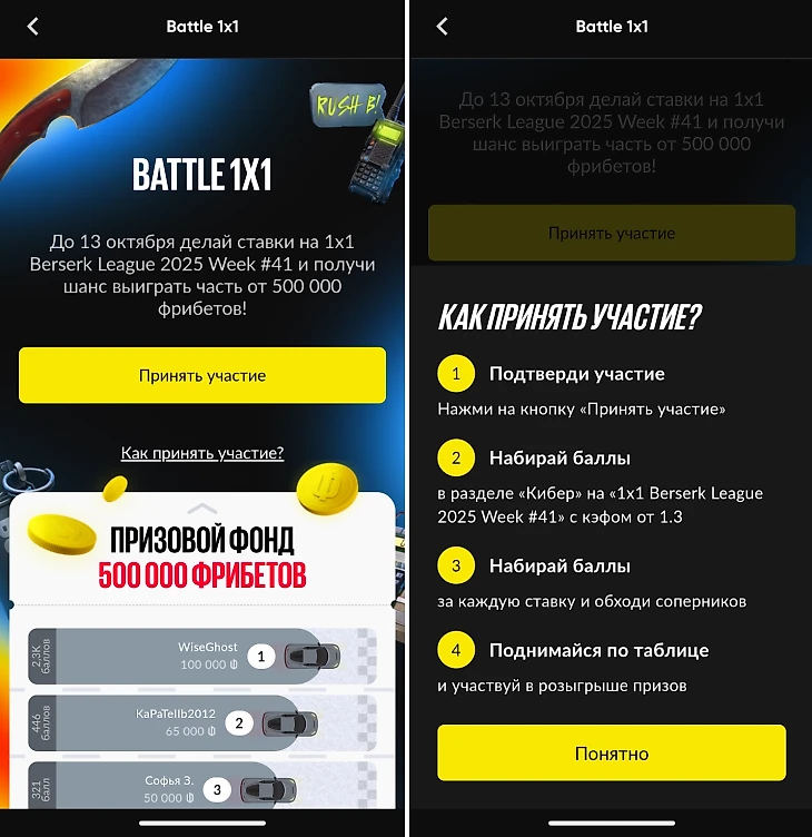 В ситуации, когда у нескольких участников оказывается идентичное количество баллов, более высокую строчку в рейтинге займет тот, кто раньше подтвердил свое участие в акции. Итоги будут подведены сразу после завершения (13 октября 2025), а уведомления о начислении фрибетов победители получат в этот же день.