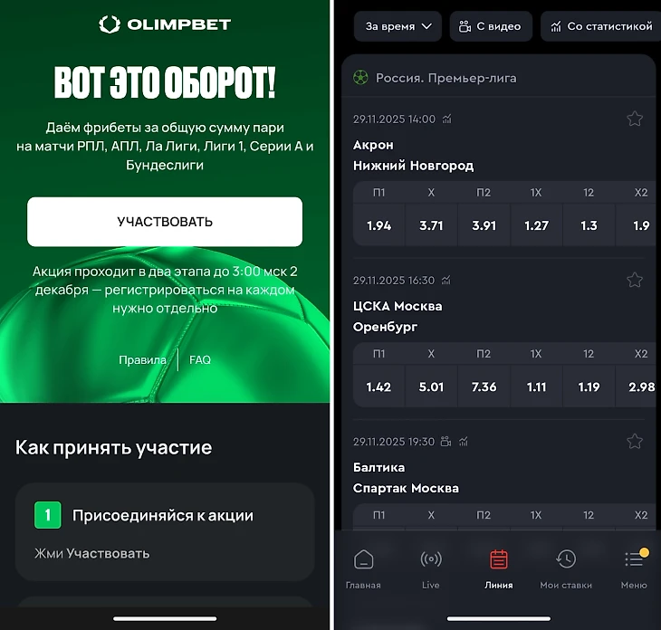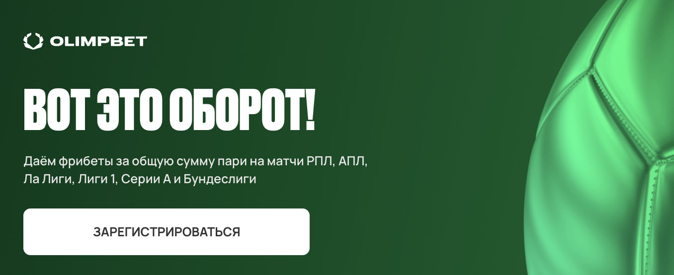 OLIMBET проводит новую акцию для любителей футбола. Ее суть – получите фрибеты за общую сумму пари на матчи РПЛ и главных футбольных лиг Евровы. Акция проходит в два этапа: делайте ставки на РПЛ, АПЛ, Ла Лигу, Лигу 1, Серию А и Бундеслигу, набирайте минимальный оборот в 5 000 рублей и получайте фрибеты – размер бонуса напрямую зависит от суммы ваших ставок.