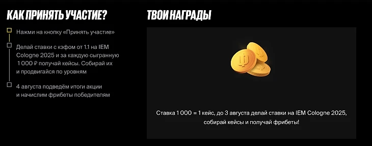 Для участия необходимо быть зарегистрированным пользователем BetBoom и нажать кнопку «Принять участие» в специальном разделе сайта или приложения. Период активности: с 12:00 (МСК) 23 июля до 23:59 (МСК) 3 августа 2025 года. Участвуют исключительно ординарные ставки на IEM Cologne 2025 с коэффициентом от 1.1, рассчитанные в указанный период.