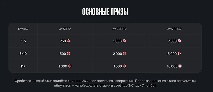 Фрибеты из всех категорий суммируются, позволяя получить до 14 500 рублей за один этап. Важно отметить, что в акции не участвуют ставки, сделанные за бонусные средства, а также возвращенные, отмененные или проданные пари. Каждая ставка учитывается только после ее расчета и только в том этапе, в котором была заключена.