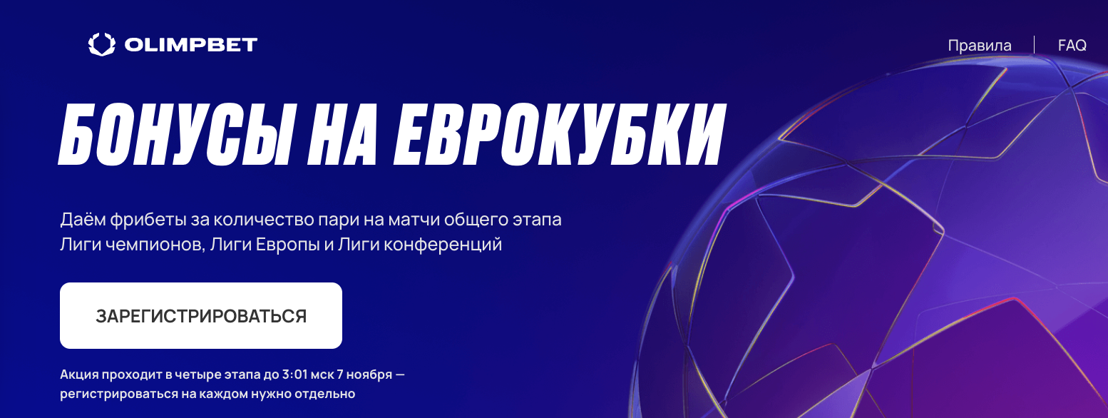 Букмекерская контора OLIMPBET запускает специальное предложение для любителей футбола – масштабную акцию «Бонусы на еврокубки». Ее суть заключается в том, что за совершение серий ставок на матчи групповых этапов трех главных европейских клубных турниров – Лиги чемпионов, Лиги Европы и Лиги конференций – вы получаете фрибеты. Чем длиннее ваша серия успешных пари в рамках каждого из четырех этапов акции, тем больше размер бонуса, который можно направить на дальнейшие ставки.