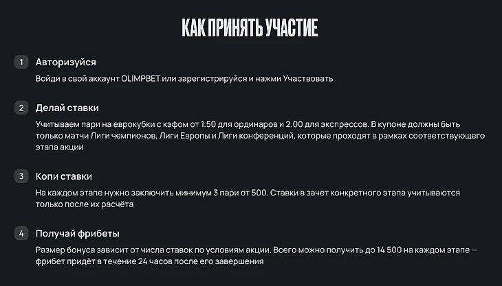 Акция проводится в четыре независимых этапа, на каждый из которых необходимо регистрироваться отдельно через нажатие кнопки «Участвовать» в соответствующем разделе сайта или приложения OLIMPBET. Участие могут принимать только совершеннолетние граждане России.