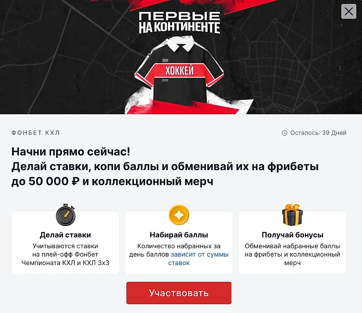 Букмекерская контора «Фонбет» поощряет любителей хоккея в рамках специальной акции «Первые на континенте». Делайте ставки на игры КХЛ 3x3 и Кубка Гагарина – за каждое пари вы будете получать баллы, которые можно обменять на фрибеты до 50 000 рублей или стильный коллекционный мерч с хоккейной тематикой. Принять участие может любой игрок, никаких ограничений по опыту или дате регистрации нет.
