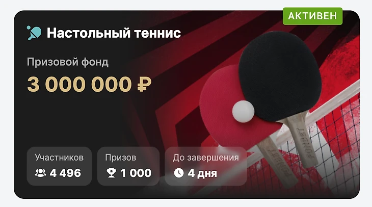 Любишь настольный теннис и делаешь ставки? Тогда турнир от «Фонбет» – то, что тебе нужно. В рамках акции букмекер каждую неделю разыгрывает фрибеты номиналом до 200 000 рублей. Все, что требуется – делать ставки на матчи из раздела «Настольный теннис» и зарабатывать баллы за успешные пари. Чем больше баллов – тем выше твоя позиция в таблице, а значит и больше шанс оказаться в числе победителей.