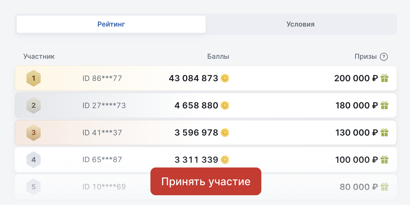 Каждое успешное пари приносит игроку баллы. Их количество равно чистой прибыле (выигрыш по ставке минус сумма самой ставки). Эти баллы формируют ваш рейтинг в таблице турнира. И чем больше успешных ставок, тем выше вы поднимаетесь в списке участников. Если несколько игроков набрали одинаковое количество очков, то преимущество получает тот, кто сделал ставку раньше.