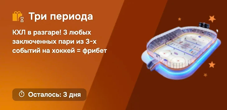 Основное задание – заключить три пари на любые исходы в матчах по хоккею. Каждое пари должно быть оформлено отдельно, а все три ставки должны быть сделаны в рамках вашего акционного интервала.