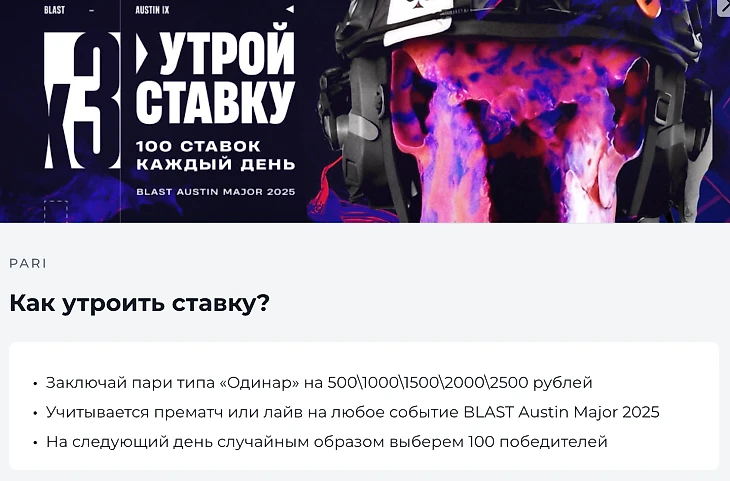 PARI запускает горячую акцию для любителей киберспорта! Заключайте пари на турнир BLAST Austin Major 2025 и получите шанс утроить свою ставку. Ежедневно 100 случайных участников, сделавших квалификационную ставку, получат фрибет номиналом в три раза больше суммы их пари.