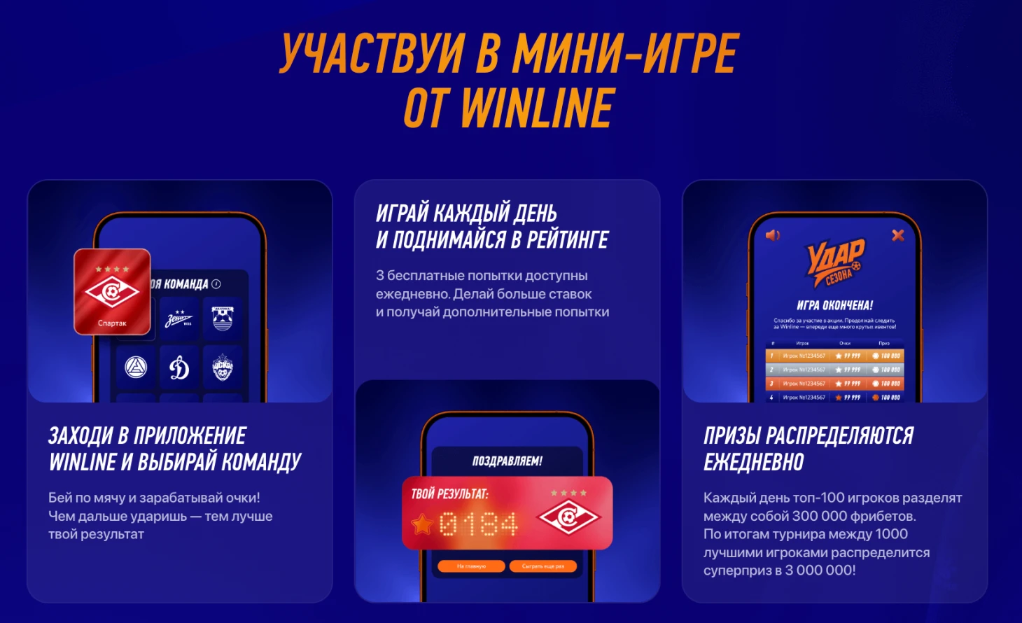 Акция «Удар сезона» от Winline – это футбольная мини-игра в мобильном приложении букмекера, где участники наносят виртуальные удары по мячу, соревнуясь за очки. Чем дальше летит мяч, тем выше результат. Лучшие игроки ежедневно и по итогам турнира делят призовой фонд в 6 000 000 фрибетов.