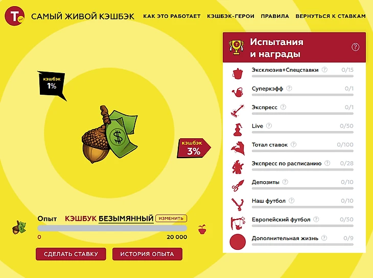 Вы делаете ставки в течение месяца и если проиграли больше, чем выиграли, то получаете бонус. Минус акции в том, что для получения возврата 5% надо сделать ставок на сумму от 100 000 рублей, максимальный бонус можно забрать за оборот в 100 000 000. Опыт обнуляется каждый месяц. Главное преимущество — отсутствие отыгрыша. Бонус начисляется реальными деньгами.
