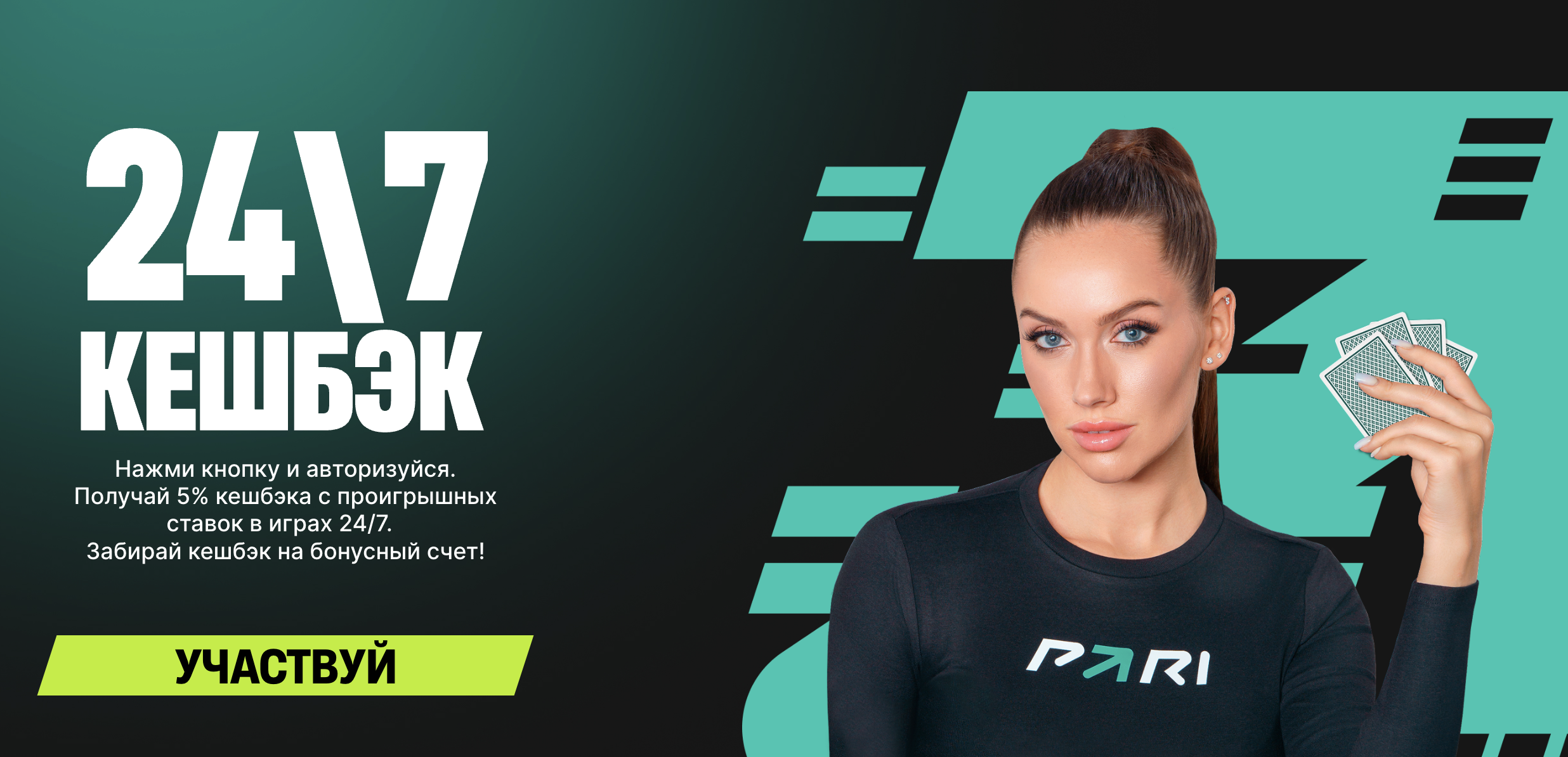 Букмекерская контора PARI предлагает всем своим клиентам возврат 5% от суммы проигрыша ставок в разделе «Игры 24/7». Максимальная сумма кэшбэка составляет 10 000 рублей.
