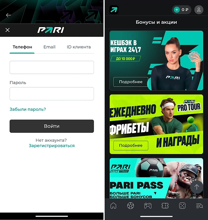 Если вы не зарегистрированы на платформе БК, то в первую очередь необходимо пройти процедуру регистрации и идентификации на сайте или в мобильном приложении БК PARI. Это два обязательных действия, без выполнения которых невозможно пополнять счет и делать ставки в букмекерской конторе.