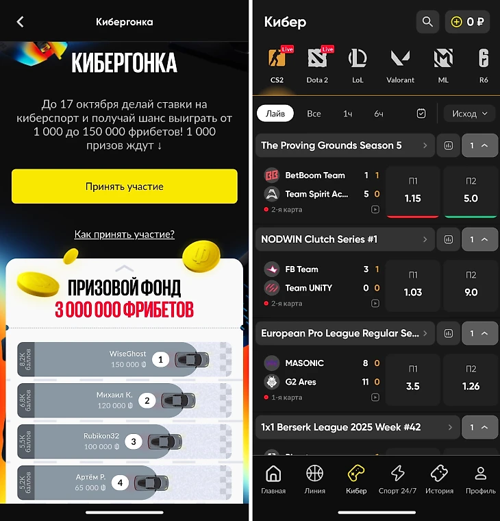 С 10 по 17 октября 2025 года букмекерская компания BetBoom проводит новый этап акции «Кибергонка» и дает шанс участникам выиграть от 1 000 до 150 000 фрибетов. Участники делают ставки на киберспорт с коэффициентом от 1.3 и набирают баллы за каждую ставку. Чем больше баллов – тем выше шанс выиграть фрибет.