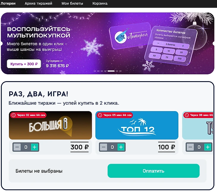 В разделе вы можете открыть «Архив тиражей» или «Мои билеты». Для покупки купона потребуется выбрать одну из лотерей и нажать «Купить».