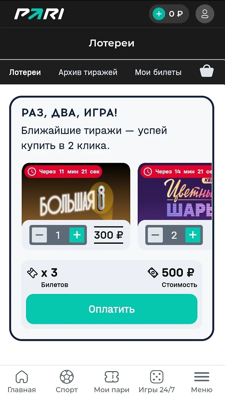 Букмекерская контора «Пари» принимает ставки не только на спорт и киберспорт, но и быстрые игры и лотереи. Возможность купить лотерейный билет в БК PARI появилась в 2024 году. За организацию и проведение тиражей отвечает «Национальная лотерея». Букмекер выступает в роли посредника. Вы можете купить билет на сайте БК PARI и в случае выигрыша, получить деньги.