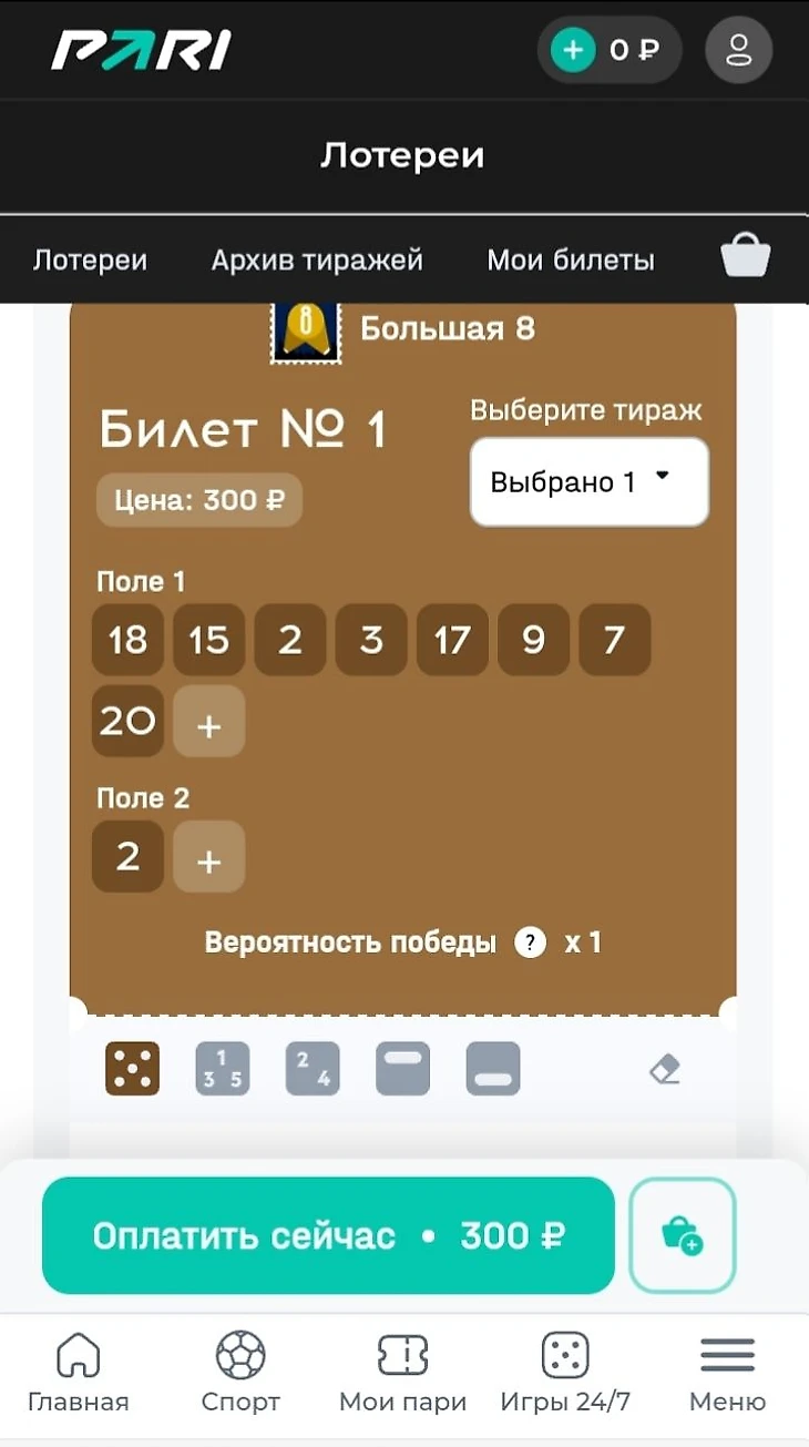 Букмекер сотрудничает с оператором «Национальная лотерея». В «Пари» можно сыграть в часть от лотерей, представленных на сайте оператора. Клиенты букмекерской конторы могут выбрать: