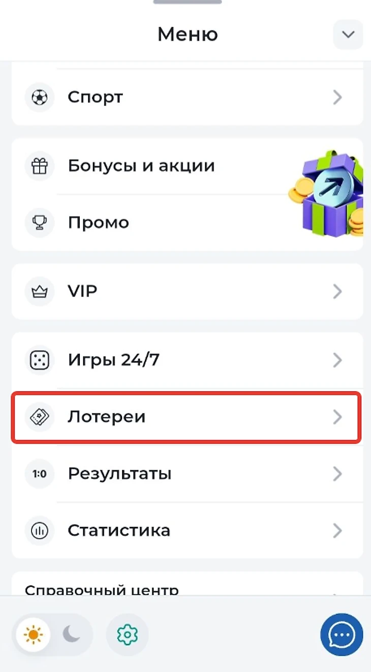 Все лотереи собраны в отдельном разделе. Чтобы к нему перейти надо на главной странице открыть боковое меню и выбрать в нем «Лотереи».