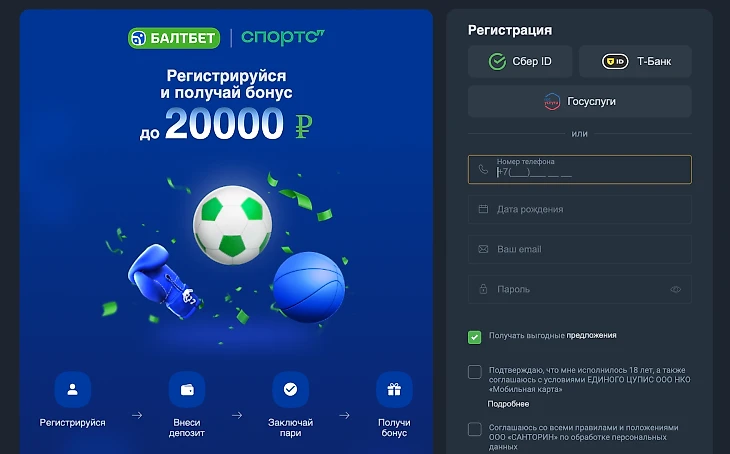 Заполнить регистрационную анкету на сайте или в приложении «Балтбет»;