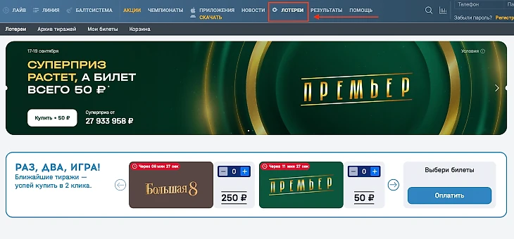 При положительном балансе можно перейти к покупке лотерейных билетов. В меню сайта букмекера есть отдельный раздел Лотереи». Для перехода к покупке билета нажмите на него.