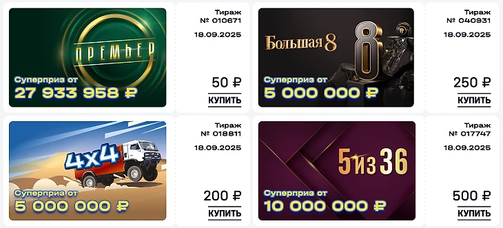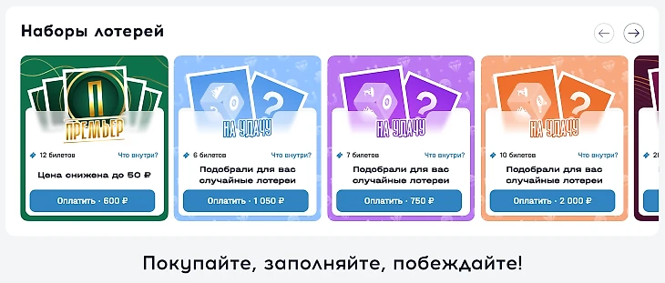 Функционал сайта предусматривает покупку одиночных билетов на несколько ближайших тиражей разных лотерей. Также игрок может приобрести набор билетов на отдельные игры.