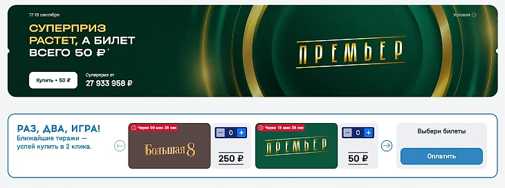«Премьер», цена билета 200 рублей, суперприз накопительный, частота розыгрышей — один раз в час;