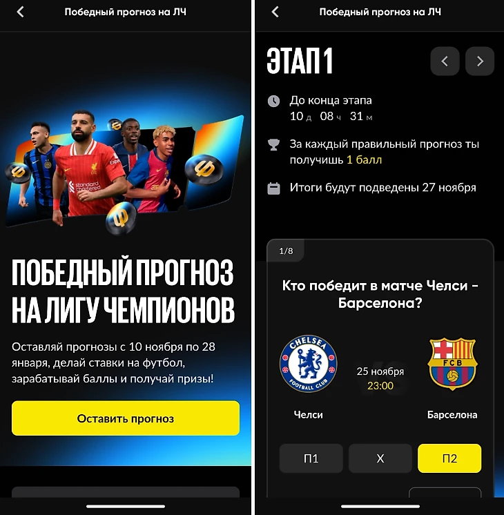 Перейдите в раздел «Акции». В нем необходимо выбрать «Победный прогноз на Лигу Чемпионов» и нажать на кнопку «Оставить прогноз».