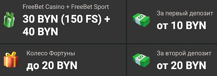 Щедрый стартовый пакет: Комбинация из фриспинов (150 FS), спортивного фрибета (40 BYN) и шанса на дополнительный бонус (до 20 BYN) дает новичку значительный дополнительный капитал на старте.
