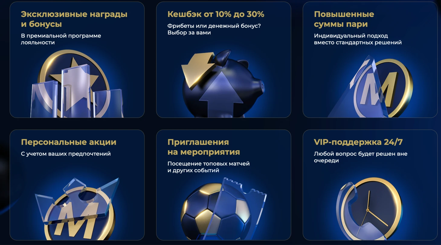 Участникам VIP клуба доступны разнообразные бонусы: повышенный кэшбэк, фрибеты или денежные выплаты, специальные акции и индивидуальные лимиты ставок. Вид бонуса можно выбирать самостоятельно в зависимости от предпочтений. Также участники получают доступ к билетам на топовые спортивные и культурные мероприятия.
