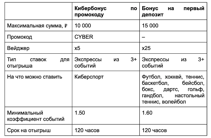 Участие в акции «Кибербонус на первый депозит» лишает игрока права на получение классического приветственного бонуса – до 15 000 рублей на стартовый депозит и повышенного до 28 000 рублей с промокодом SPORTS28.