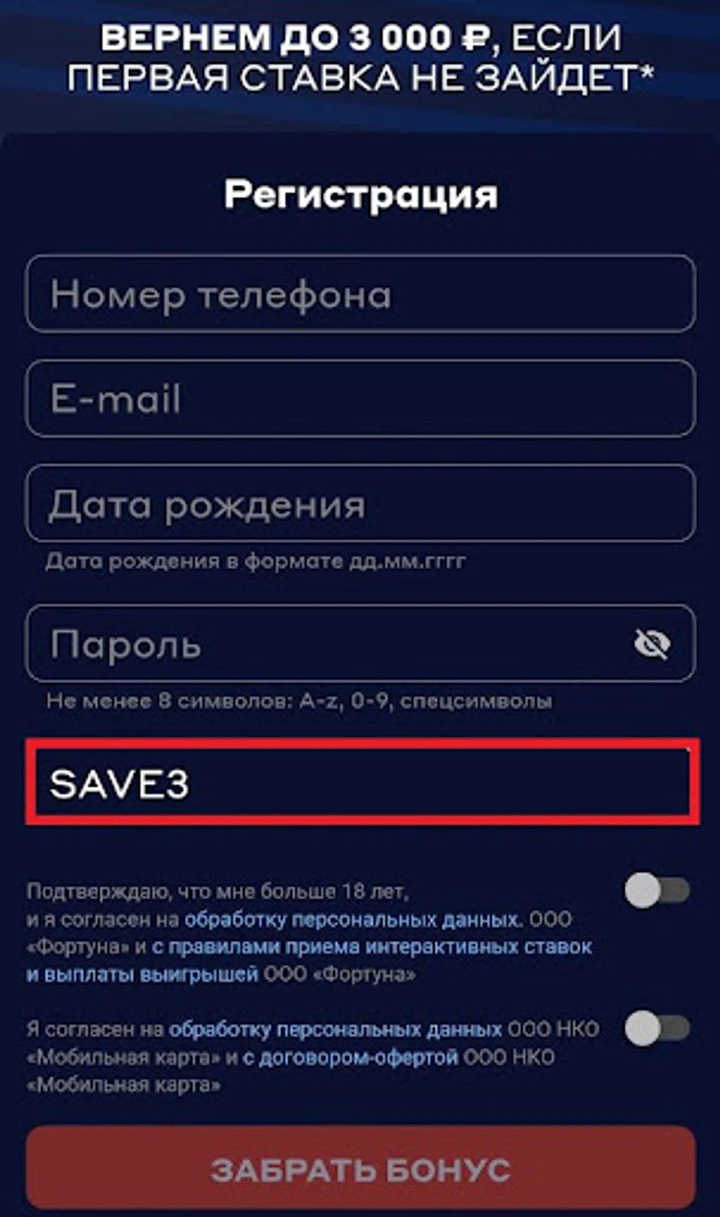 Необходимо скачать приложение «БЕТСИТИ», пройти в нем регистрацию, указав в процессе промокод «SAVE3», затем внести online-депозит и заключить пари с кэфом до 3.00. Если прогноз окажется неудачным, вы заберете 100% от поставленной суммы до 3 000 ₽.