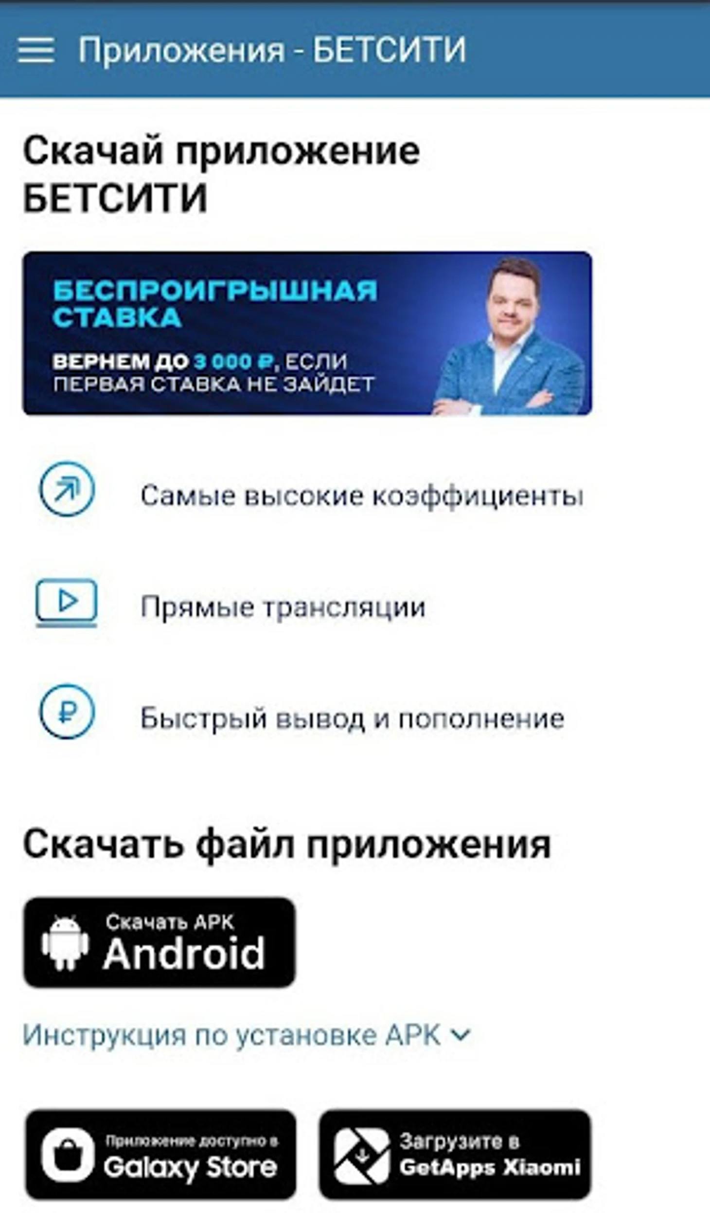 Скачать приложение «БЕТСИТИ» на Android или iOS в зависимости от устройства. Версию на Android можно загрузить с мобильного сайта БК, из магазинов RuStore, Galaxy Store, AppGallery, GetApps и NashStore, версию для iPhone или iPad – только из AppStore.