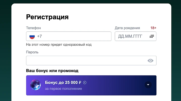 В процессе регистрации вам не нужно указывать бонусный код – достаточно выбрать бонус из списка. Ввести промокод необходимо при первом пополнении баланса.