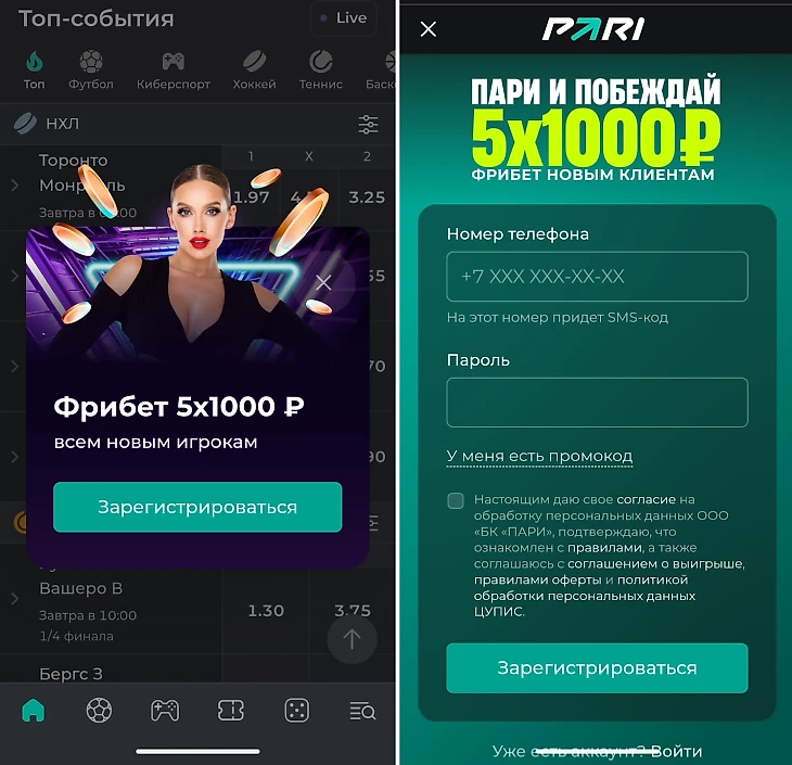 Бонус доступен только новым клиентам, поэтому в первую очередь потребуется зарегистрироваться на сайте или в приложении «Пари». Для регистрации необходимо указать номер мобильного телефона и пароль.