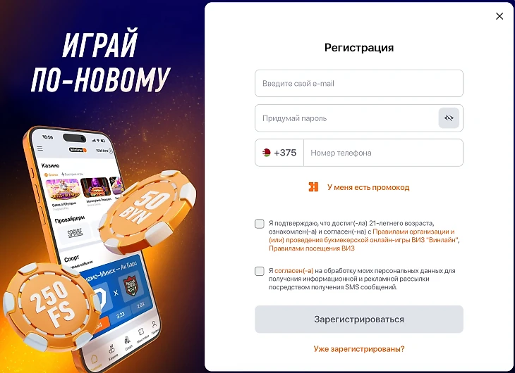 Winline в Республике Беларусь теперь не только букмекер, но и казино! Всем новым клиентам предлагается приветственный фрибет размером 50 белорусских рублей, а также 250 фриспинов для игры в казино – за регистрацию и депозит от 10 BYN. Ниже вас ждет гайд по получению бонусов и их использованию.
