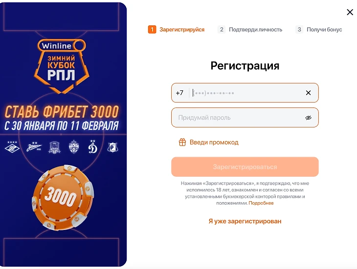 После установки приложения на телефон потребуется запустить его и пройти регистрацию. В букмекерской конторе Winline в форме регистрации всего два поля: