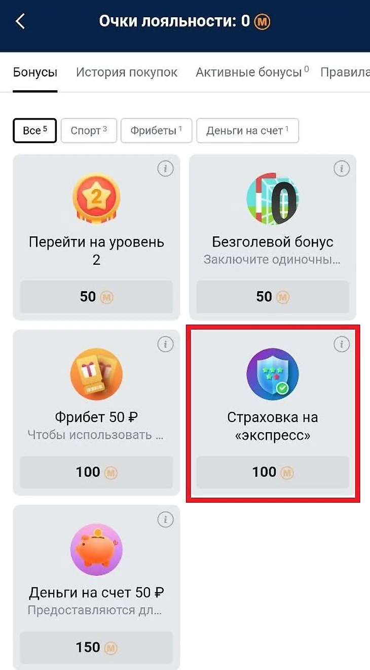 Фрибет будет начислен по первым 5 экспрессам, которые соответствуют условиям. Если хотите получить страховку за 6-й и последующие экспрессы, нужно вновь насобирать 100 баллов лояльности и купить бонус.