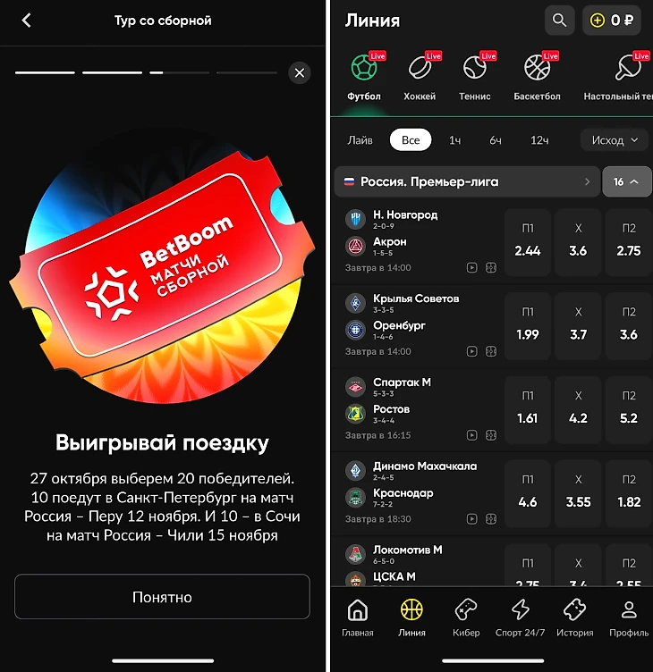 Букмекер BetBoom предлагает клиентам отправиться на товарищеские матчи сборной России по футболу в качестве главного приза акции «Тур со сборной». Участникам предстоит побороться за двадцать полноценных путешествий в Санкт-Петербург или Сочи. Для этого необходимо выполнить простые условия, связанные со ставками на футбол, и удача может улыбнуться именно вам.