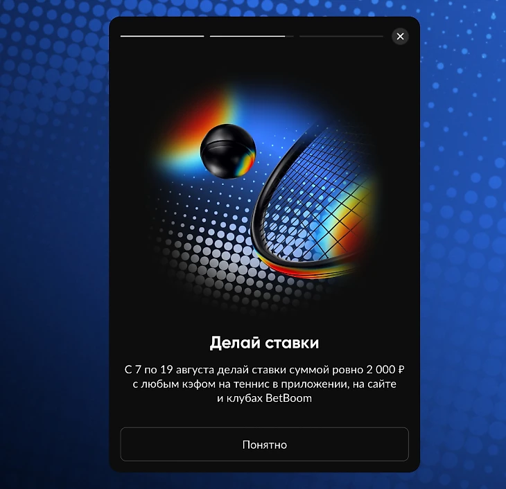 С 7 по 19 августа BetBoom дарит игрокам шанс удвоить ставки на теннис. Участвуйте в акции – делайте ставки на теннис суммой ровно 2 000 рублей, и если ваша ставка попадет в число выбранных, BetBoom удвоит ее размер!