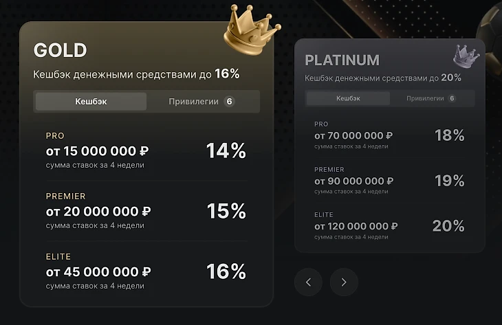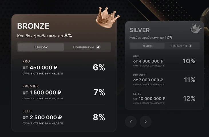 В программе лояльности четыре основных статуса, в каждом из которых по три уровня. В зависимости от статуса игроки получают кэшбэк фрибетами от 6 до 20%.